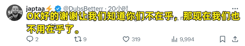 發(fā)布時間:2025年01月15日 12:50點擊:欄目:籃球新聞 昨日不敵猛龍的賽后,庫里在接受采訪時表示:“孤注一擲的交易或者行為會耗盡未來,當我們結束這一切時,我們有責任讓球隊保持一個良好的空間和良好的狀態(tài)。”這句話引發(fā)了勇士球迷的熱烈討論,我們一起來看:相關內容>>庫里:不能以“孤注一擲”的交易為代價 因為這將耗盡球隊未來有轉變 除特別注明外,本站所有內容均為九球直播整理排版,轉載請注明出處:庫里球迷怒噴庫里:軟蛋言論!擺爛是吧?我不看了! 本文標簽: 籃球 nba 勇士 庫里