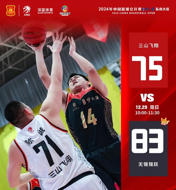 比賽開場,三山飛翔即展現(xiàn)良好狀態(tài),5號張玉圣歸來,登場即貢獻1釘板大帽,球星級別表現(xiàn)點燃全場。無錫錫躍未受影響,66號王殿文進攻端內(nèi)突外投持續(xù)建功,6號朱晨曦則在防守端表現(xiàn)積極,全力壓制對手。但三山飛翔同樣通過精妙配合將球傳至5號張玉圣手中,攻勢相當(dāng)猛烈。兩隊再現(xiàn)小組賽血戰(zhàn)情節(jié),將懸念保持到最后一刻,無錫錫躍6號朱晨曦關(guān)鍵兩分追平比分后,66號王殿文、23號周宸等再續(xù)火力,三山飛翔難抵壓力,71號陳誠、5號張玉圣雖有關(guān)鍵進球試圖再救主,但無奈無錫錫躍信念感十足,手感火熱,最終復(fù)仇成功,以83-75拿下本場勝利。
