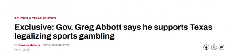 “州長阿博特說他不反對德克薩斯州議會通過一項法律,加入其他 39 個已將在線體育博彩合法化的州的行列。他說,他認為體育博彩是觀看職業(yè)橄欖球和其他體育比賽的娛樂活動的一部分。”