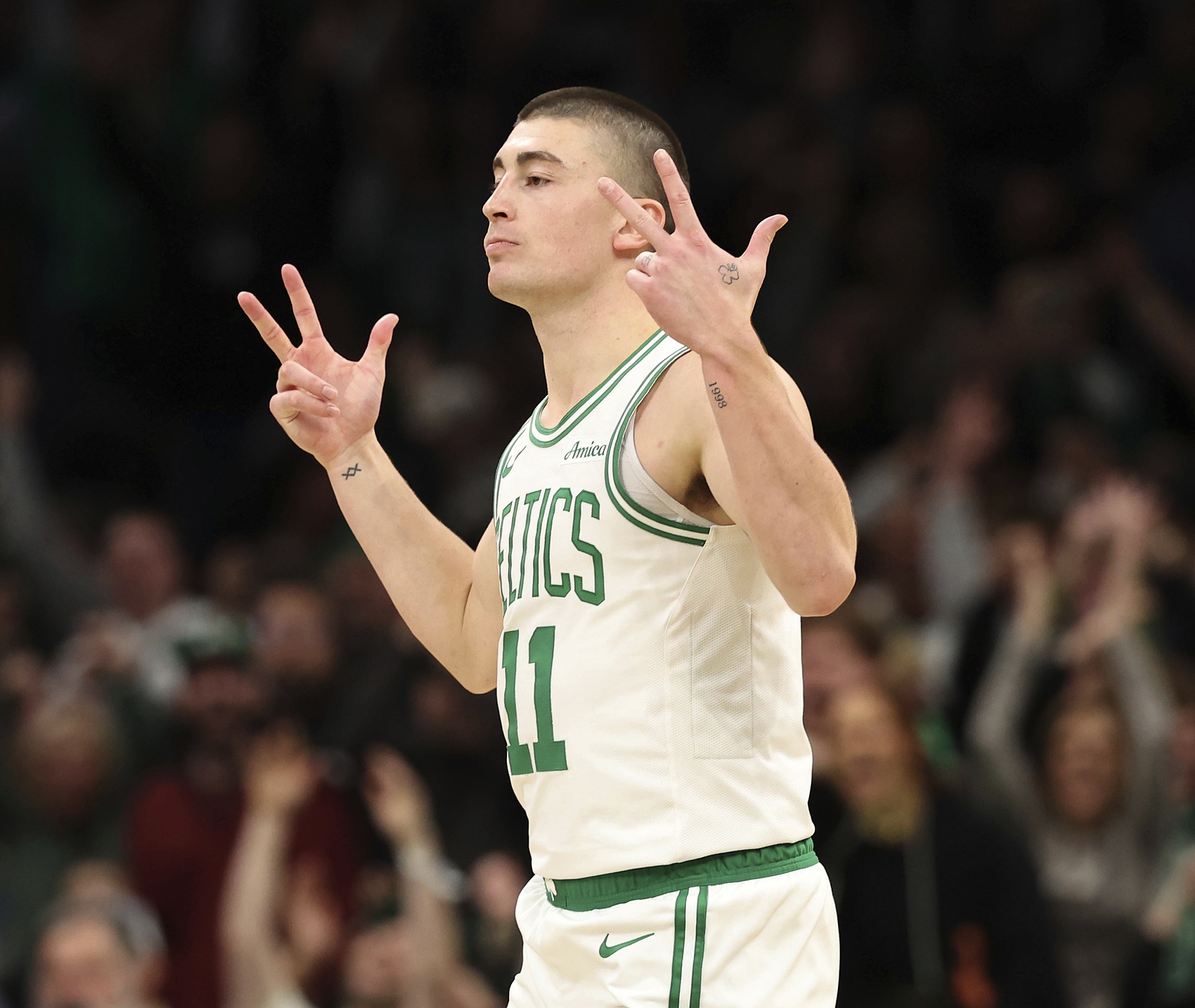 G5半場結(jié)束前4秒,普理查德替補(bǔ)登場。凱爾特人全隊(duì)接到指示,要盡力將球交到他手中。在東契奇罰球不中后,霍福德?lián)屜禄@板,迅速尋找普理查德。雖然看到東契奇上前干擾,但霍福德知道這位全明星來不及封堵。普理查德告訴自己:把球投出去,給它一個(gè)機(jī)會(huì)。起初,他完全沒有意識(shí)到周圍正在醞釀的瘋狂。