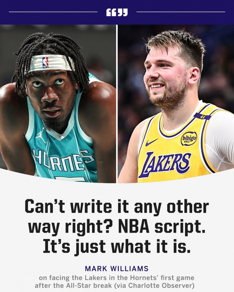 談到自己重返黃蜂后的首場比賽就將面對湖人,馬威表示:“不能寫出任何別的劇本了,對吧?NBA劇本嘛,就是這樣(NBA script. It’s just what it is)?!?/p>