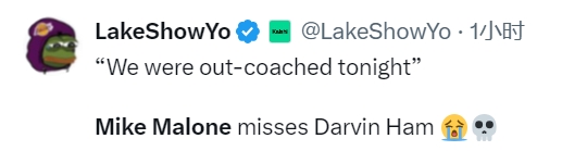 發(fā)布時(shí)間:2025年02月23日 15:53點(diǎn)擊:欄目:籃球新聞 02月23日訊 NBA常規(guī)賽,掘金在主場(chǎng)以100-123不敵湖人。賽后,馬龍?jiān)诮邮懿稍L時(shí)表示:“我們今晚的執(zhí)教被爆了(we were outcoached tonight.)”湖媒曬出哈姆的名句“馬德,我壓根不知道怎么辦”來(lái)打趣說(shuō):“馬龍肯定是想念哈姆了?!?/p> 除特別注明外,本站所有內(nèi)容均為九球直播整理排版,轉(zhuǎn)載請(qǐng)注明出處:馬龍稱自己今晚被JJ爆了!湖媒調(diào)侃:想念哈姆了是吧? 本文標(biāo)簽: 籃球 nba 湖人 掘金 雄鹿