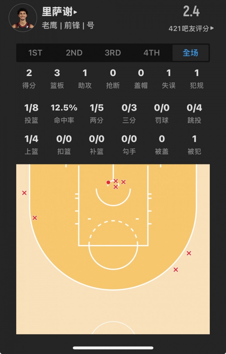 老鷹狀元秀 扎卡里-里薩謝 登場(chǎng)26.5分鐘