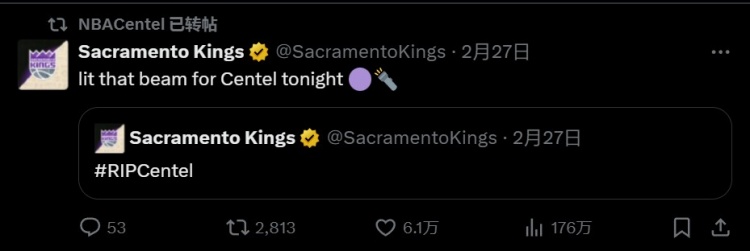 很多賬號都對NBA Centel的回歸感到振奮,活塞、國王、熱火、太陽的官推都向NBA Centel送上了祝賀。