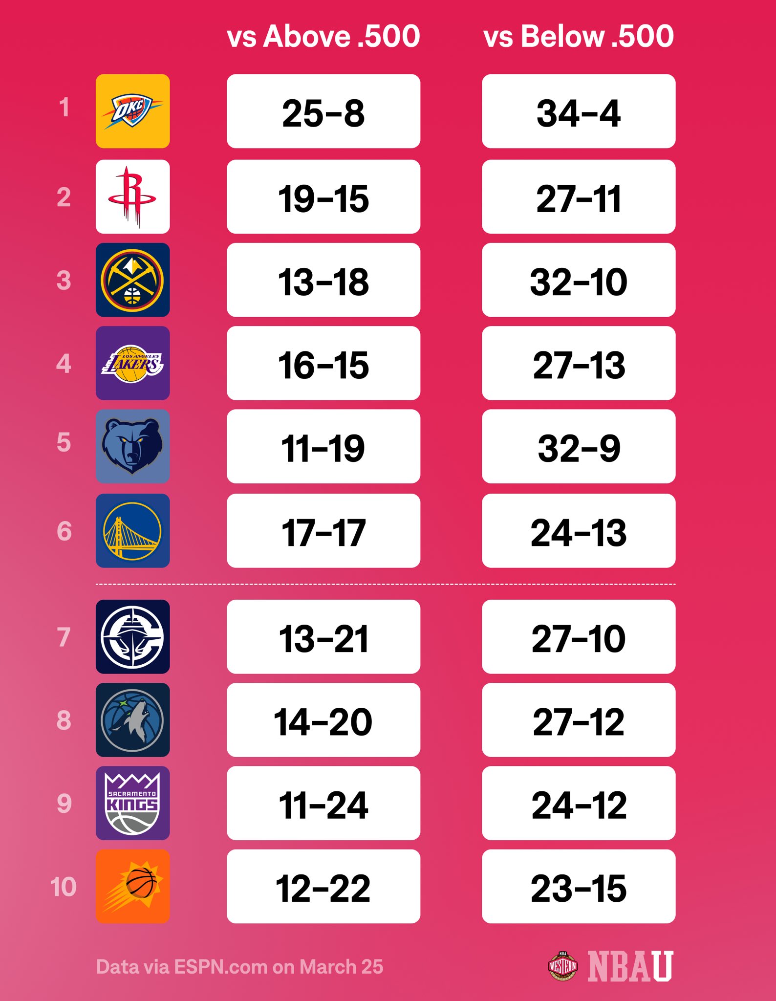 有亮點?東西部TOP10球隊VS強隊&弱隊的勝率對比!