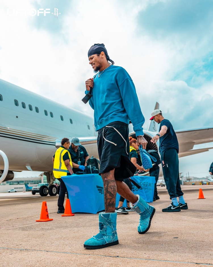 今天,火箭官推曬出了球員的登機(jī)照,杰林-格林的藍(lán)色靴子很是惹眼。
