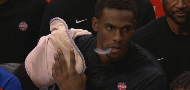 比賽進(jìn)行到末節(jié),杜倫在一次進(jìn)攻的時(shí)候手被拉了一下,肩膀疑似出現(xiàn)不適,坐在板凳席上裹著厚厚的繃帶。