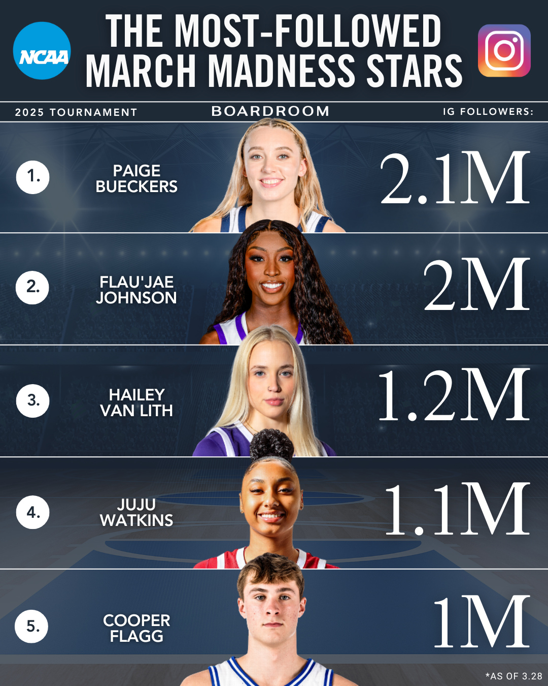 03月30日訊 美媒Boardroom今日統(tǒng)計(jì)了本屆NCAA瘋?cè)騿T的Instagram粉絲排名,NBA狀元大熱弗拉格以100萬粉絲排名第5,粉絲數(shù)“僅為”WNBA狀元大熱佩奇-布克斯的一半不到。