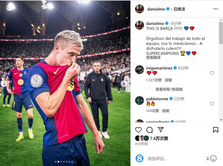 奧爾莫在社交媒體上曬出親吻巴薩隊(duì)徽的照片,并配文:“這就是巴薩!為全隊(duì)的努力感到驕傲,我們當(dāng)之無(wú)愧。盡情享受吧,巴薩球迷們!西超杯冠軍?!?/p>