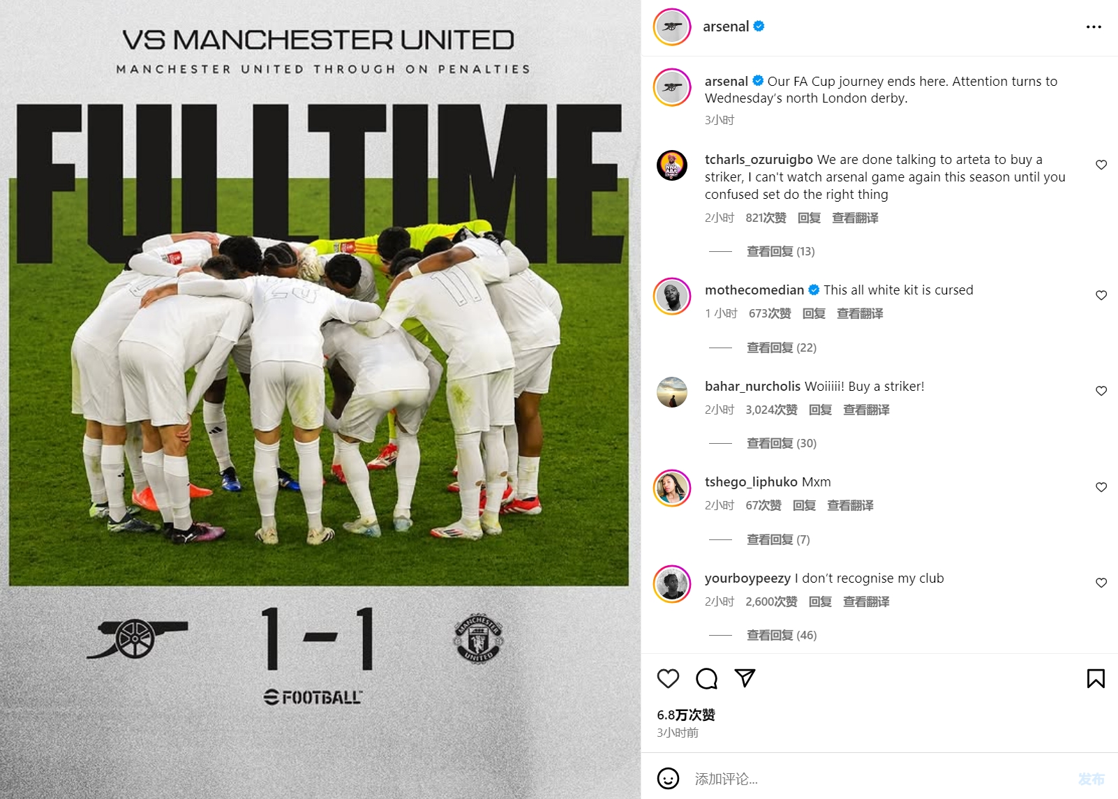 1月13日訊 本輪足總杯,曼聯(lián)120分鐘1-1戰(zhàn)平阿森納,點(diǎn)球戰(zhàn)曼聯(lián)取勝。賽后,阿森納的社媒戰(zhàn)報(bào)又一次被大量負(fù)面評(píng)論刷屏。