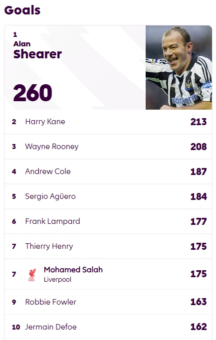 8、薩拉赫(現(xiàn)役 利物浦):175球