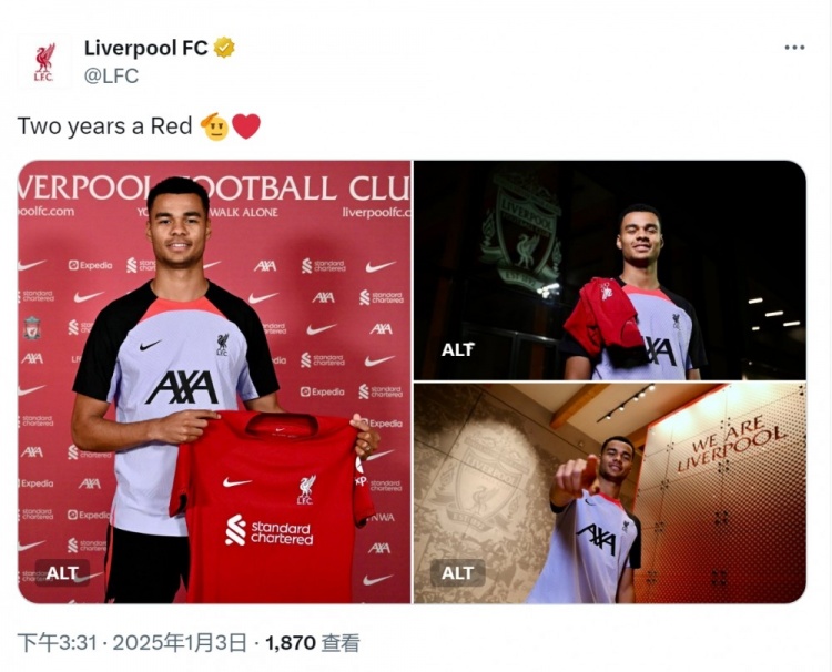 利物浦官方社媒曬出加克波加盟時(shí)的照片,并配文:“成為紅軍兩周年?!?/p>