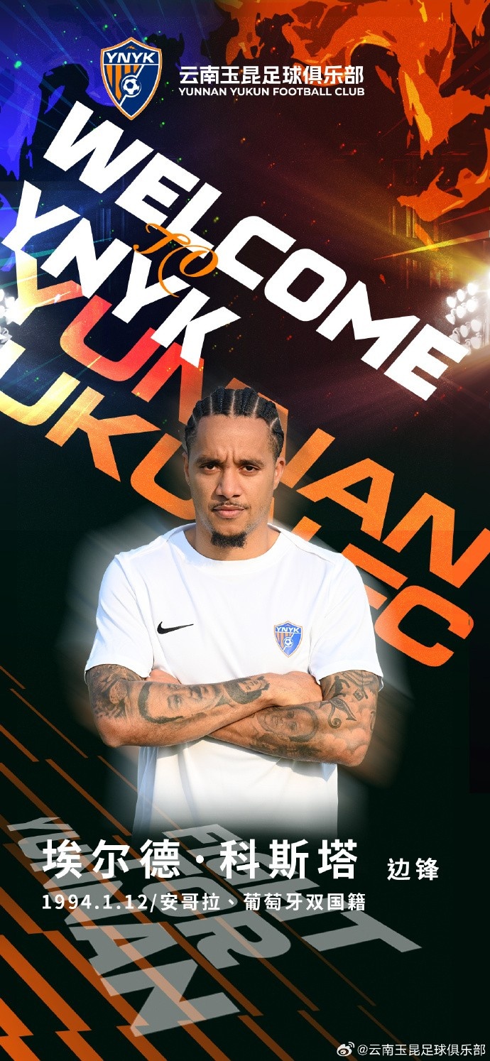 1月24日訊 中超升班馬云南玉昆官方宣布,外援埃爾德-科斯塔與西班牙籍球員何塞-安東尼奧-馬丁內斯正式加盟球隊。