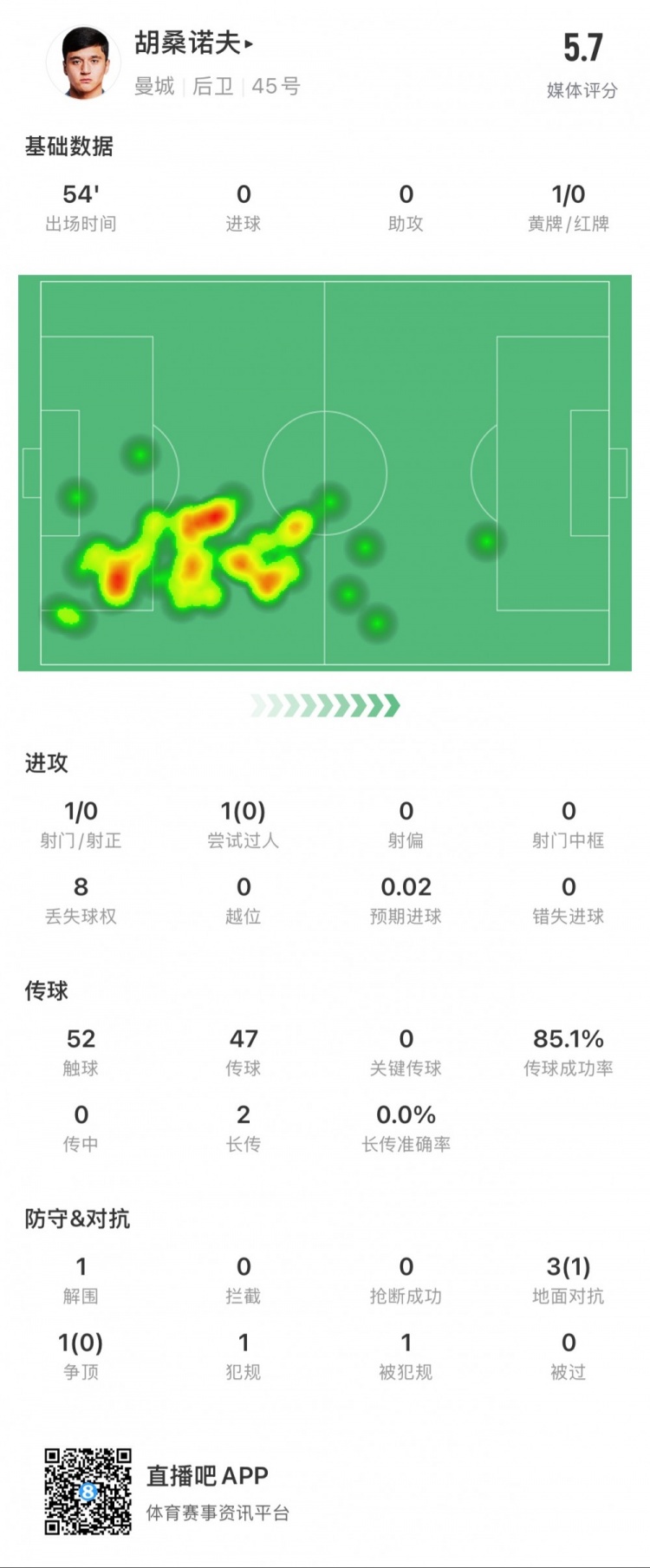 1月26日訊 英超第22輪,曼城對(duì)陣切爾西。本場(chǎng)比賽上演首秀的胡桑諾夫全場(chǎng)數(shù)據(jù):