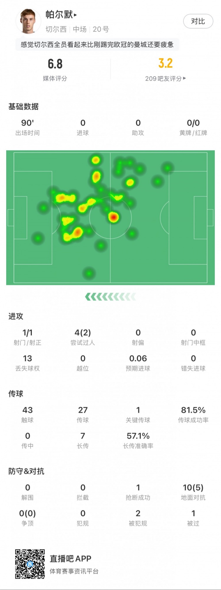除特別注明外,本站所有內(nèi)容均為九球直播整理排版,轉(zhuǎn)載請注明出處:戰(zhàn)舊主!帕爾默本場數(shù)據(jù):1次關(guān)鍵傳球,1次射門,2次成功過人