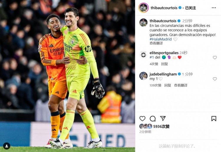 庫(kù)爾圖瓦曬出了與絕殺功臣貝林厄姆的合照,并配文:正是在最困難的情況下,獲勝團(tuán)隊(duì)才會(huì)得到認(rèn)可。優(yōu)秀的示范團(tuán)隊(duì)!