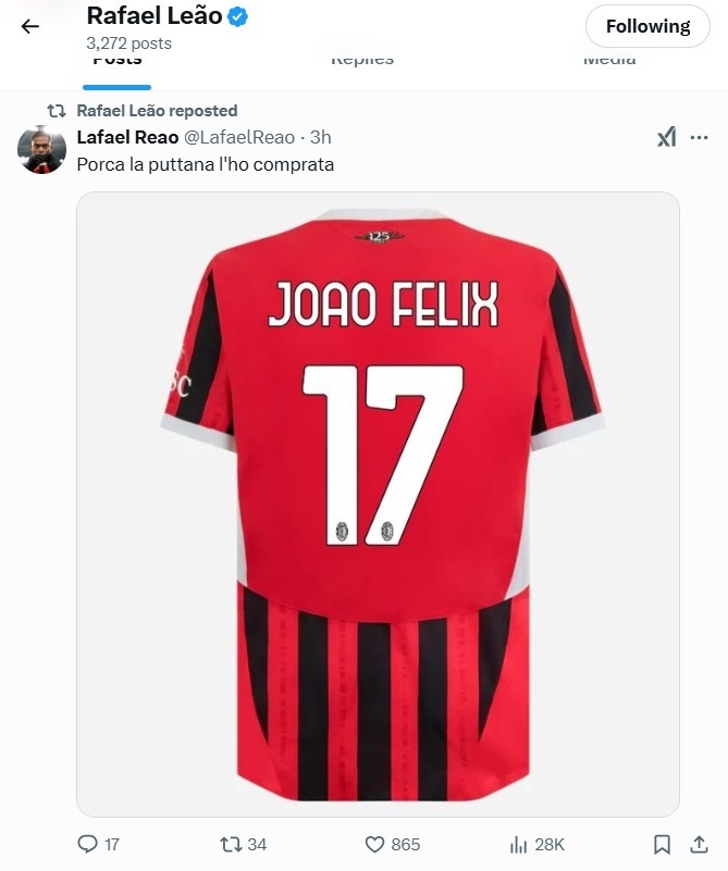 發(fā)布時間:2025年02月04日 00:50點擊:欄目:足球新聞 2月4日訊 羅馬諾報道,切爾西前鋒菲利克斯將租借加盟米蘭。米蘭邊鋒萊奧在社媒上轉(zhuǎn)發(fā)了一則動態(tài),動態(tài)中這位米蘭球迷博主表示道:“該死,我買了這件球衣”。圖片中是米蘭本賽季的球衣,印的名字是菲利克斯,印號是17號。 除特別注明外,本站所有內(nèi)容均為九球直播整理排版,轉(zhuǎn)載請注明出處:隊友宣?萊奧本人轉(zhuǎn)發(fā)了菲利克斯米蘭17號球衣的動態(tài) 本文標簽: 足球 英超 切爾西 意甲 AC米蘭