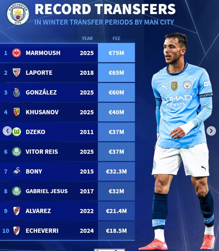 2月4日訊 曼城已經(jīng)官宣簽下波爾圖中場(chǎng)尼科-岡薩雷斯,《轉(zhuǎn)會(huì)市場(chǎng)》也統(tǒng)計(jì)了曼城隊(duì)史冬窗引援榜情況。