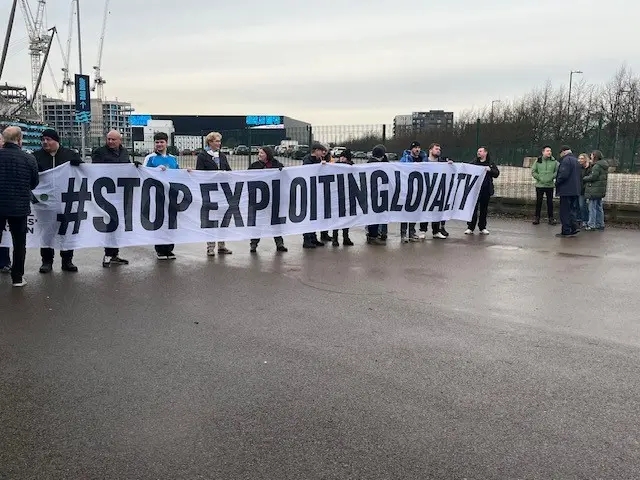 1月4日訊 據(jù)BBC報(bào)道,在曼城主場(chǎng)伊蒂哈德球場(chǎng)外,有球迷在抗議英超球票漲價(jià)。