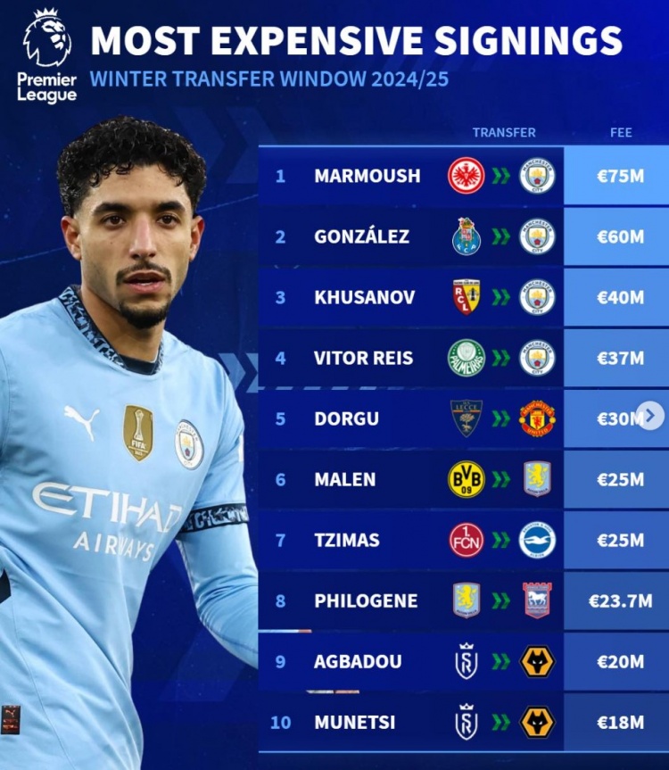 2月10日訊 五大聯(lián)賽冬窗已經(jīng)關(guān)閉,《轉(zhuǎn)會(huì)市場(chǎng)》也統(tǒng)計(jì)了本賽季英超冬窗最貴轉(zhuǎn)會(huì)榜,曼城獨(dú)占前四。