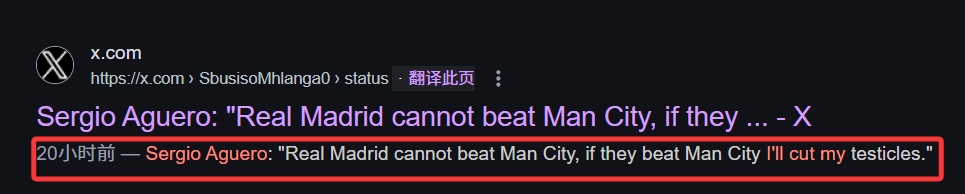 這條所謂的阿圭羅發(fā)言是這樣說的:“皇馬贏不了曼城,如果他們贏了,我把自己的蛋蛋切了?!?/p>