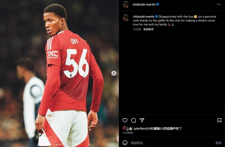 2月17日訊 英超本輪焦點戰(zhàn)中,曼聯(lián)0-1不敵熱刺。比賽尾聲階段,小將奧比-馬丁替補登場。賽后,他更新了社媒紀(jì)念自己的曼聯(lián)一線隊首秀。