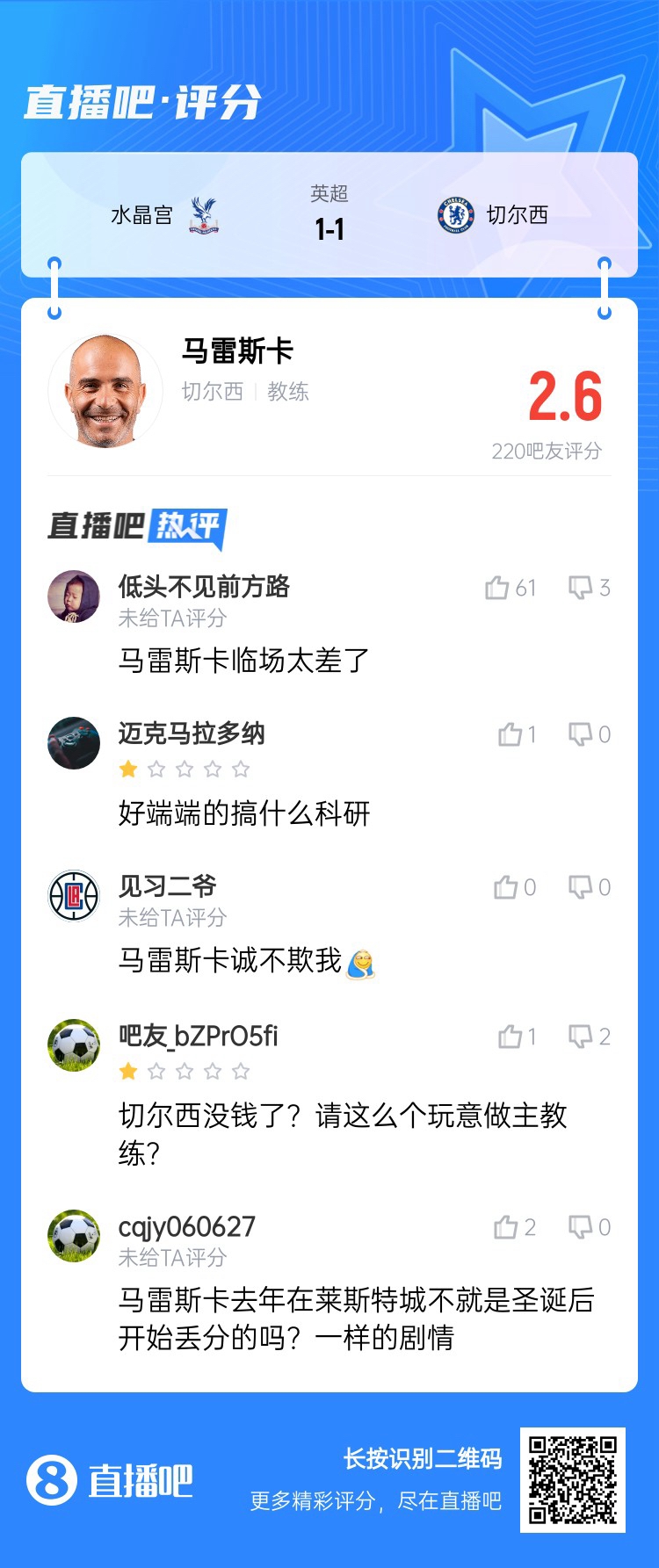 01月05日訊 昨晚切爾西1-1戰(zhàn)平水晶宮,遭遇四場(chǎng)不勝。本場(chǎng)比賽馬雷斯卡僅用了2個(gè)換人名額。