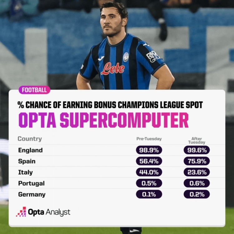 發(fā)布時(shí)間:2025年02月19日 21:50點(diǎn)擊:欄目:足球新聞 2月19日訊 在今天凌晨歐冠比賽后,Opta更新了獲得下賽季歐冠額外席位的概率,在米蘭和亞特蘭大被淘汰后,意甲的概率從44.0%降至23.6%。Opta下賽季歐冠額外席位概率:英超99.6%西甲75.9%意甲23.6%葡超0.6%德甲0.2% 除特別注明外,本站所有內(nèi)容均為九球直播整理排版,轉(zhuǎn)載請(qǐng)注明出處:Opta下賽季歐冠額外席位概率:英超99.6%,西甲75.9%,意甲23.6% 本文標(biāo)簽: 足球 英超 西甲 意甲 德甲 歐冠