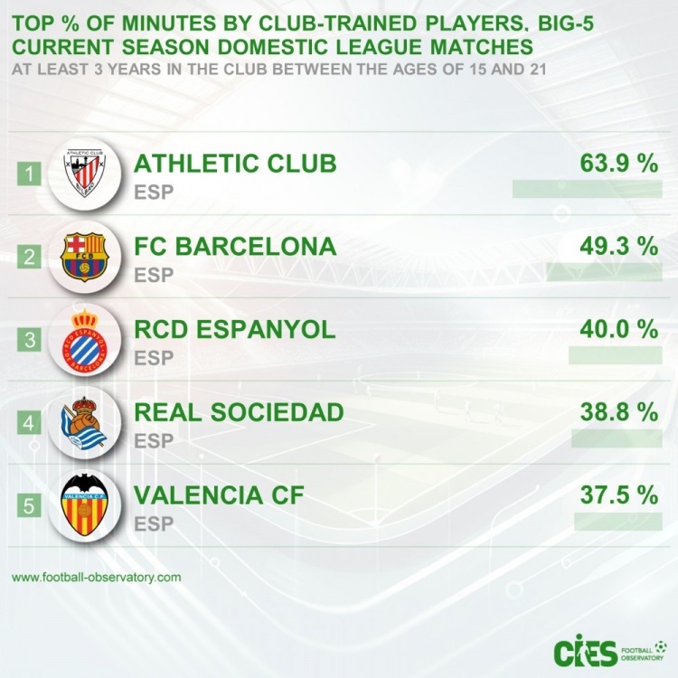 2月22日訊 瑞士足球天文臺統(tǒng)計了本賽季五大聯(lián)賽球隊自家青訓(xùn)球員的出場時間占全隊的比例,并列出榜單,畢爾巴鄂63.9%居首,巴薩49.3%第二,前5名皆為西甲球隊。