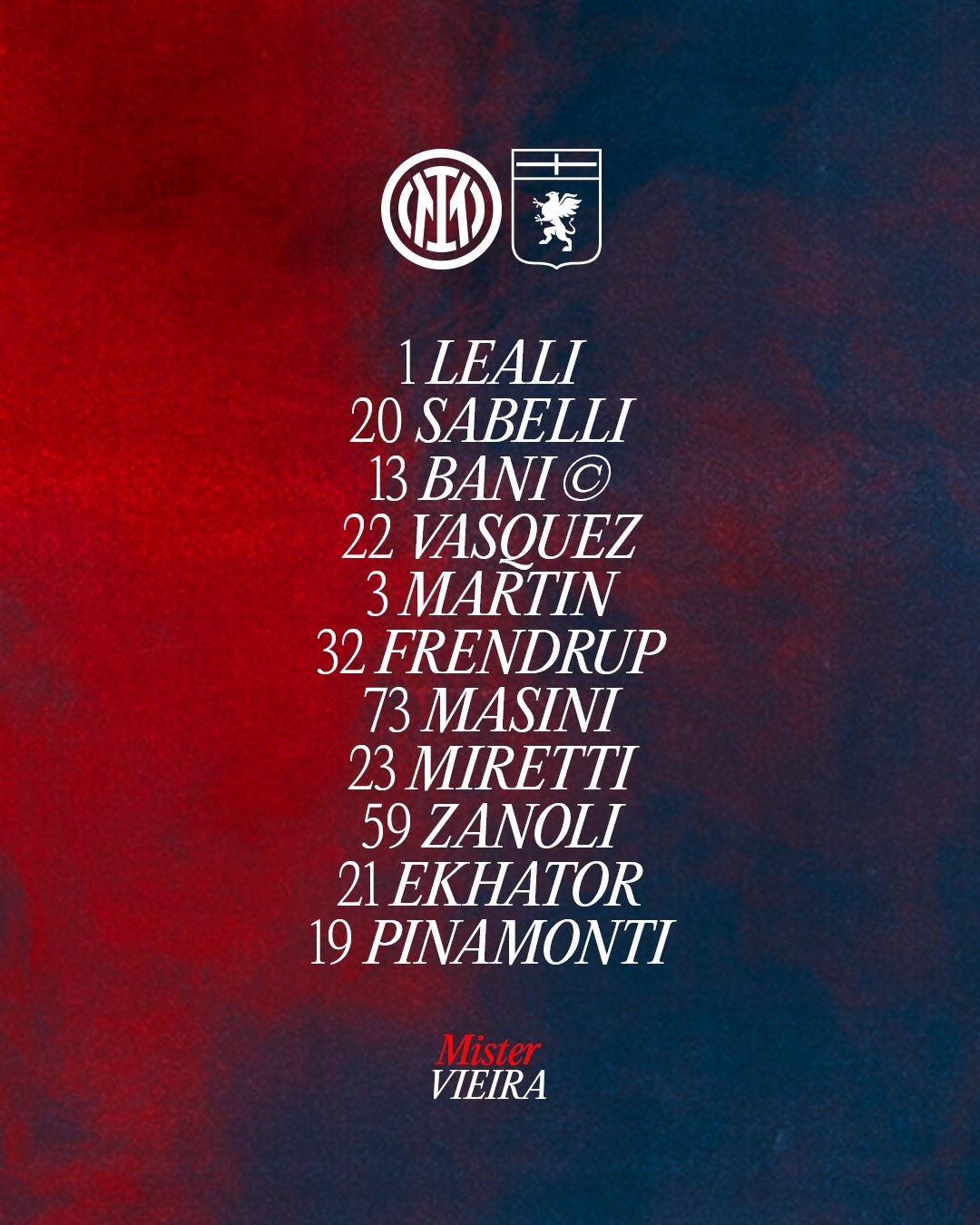 熱那亞首發(fā):1-尼科拉-萊亞利、20-薩貝利、13-巴尼、22-J-巴斯克斯、3-阿隆-馬丁、32-弗倫德盧普、73-馬斯尼、23-米雷蒂、59-薩諾里、21-埃卡托、19-皮納蒙蒂