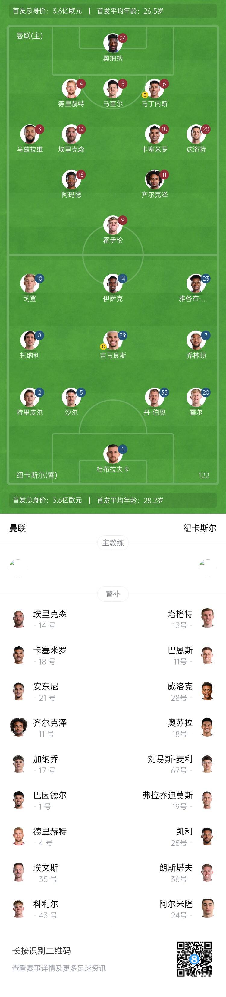 曼聯(lián)首發(fā):24-奧納納、3-馬茲拉維、4-德里赫特、5-馬奎爾、6-利桑德羅、20-達洛特、18-卡塞米羅、14-埃里克森、16-阿瑪?shù)?迪亞洛、11-齊爾克澤、9-霍伊倫