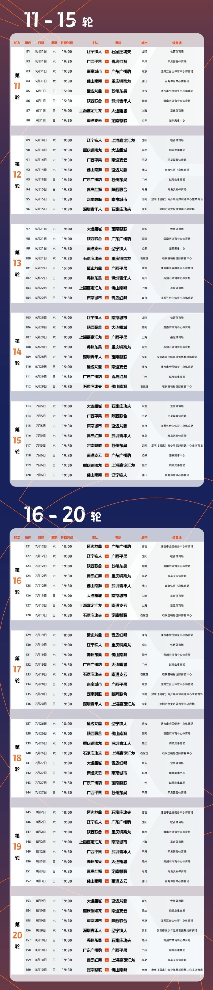 其中,首輪比賽,重慶銅梁龍、南通支云、廣東廣州豹、廣西平果、定南贛聯、深圳青年人、蘇州東吳、南京城市分別在主場作戰(zhàn)。第29輪、第30輪,中甲8場比賽將同時開賽。