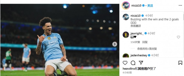 3月2日訊 足總杯1/8決賽,曼城3-1普利茅斯。賽后,本場比賽打進2球的奧賴利更新了自己的ins。