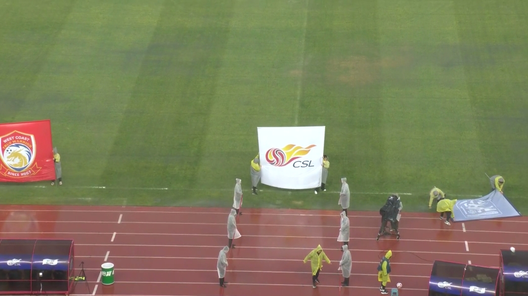 中超第2輪,青島西海岸vs武漢三鎮(zhèn)。比賽目前推遲15分鐘,現(xiàn)場旗幟被吹倒。