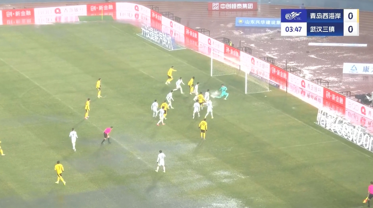 比賽第4分鐘,西海岸球員射門,因場地積水嚴(yán)重,皮球在門線前緩緩?fù)O?,阿齊茲門前補(bǔ)射破門。青島西海岸1-0領(lǐng)先武漢三鎮(zhèn)。