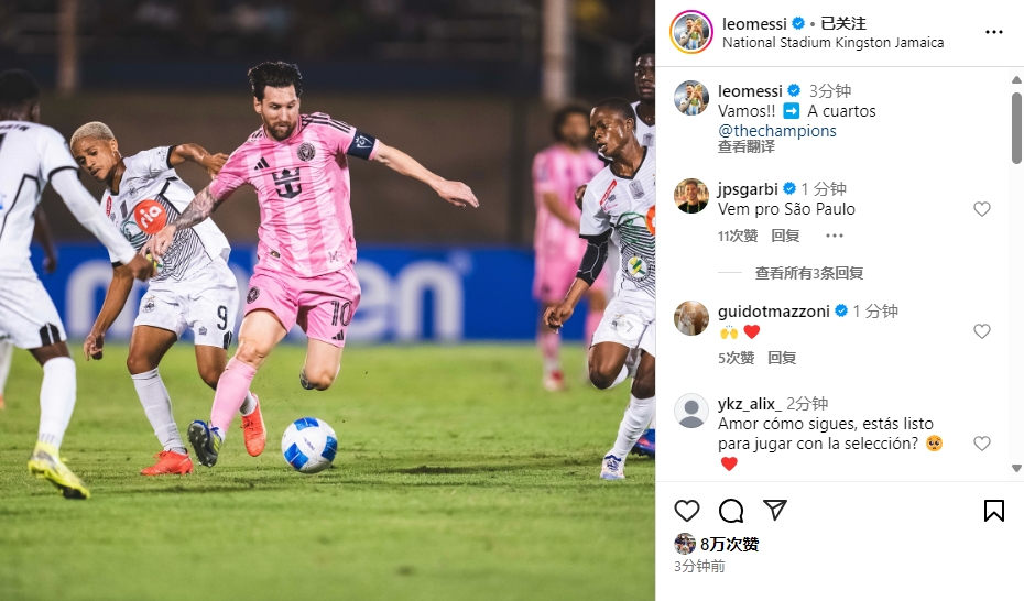 賽后梅西更新ins寫(xiě)道:加油?。?span style=" 0, 0)">??進(jìn)入1/4決賽!