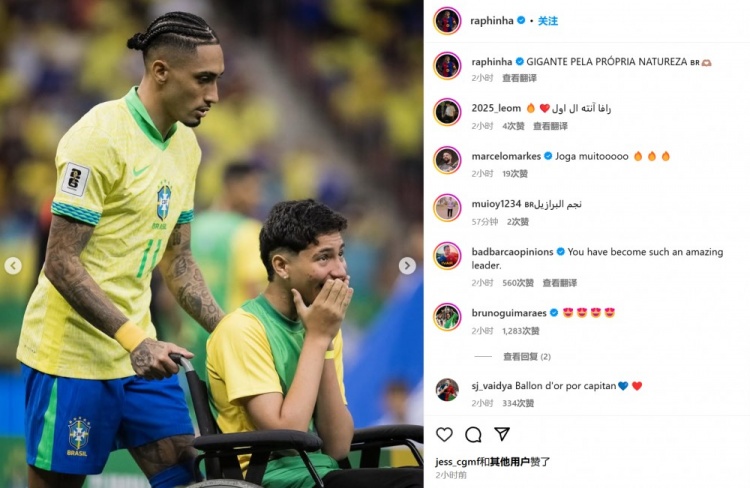 拉菲尼亞也通過(guò)社媒曬出自己賽前為殘障球迷手推輪椅的照片,并配文:“他們?cè)谛撵`層面是巨人。”