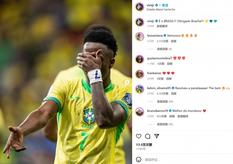維尼修斯也在賽后通過(guò)社媒曬出自己的慶祝照,并配文:“這就是巴西?。?!感謝巴西利亞!??!”