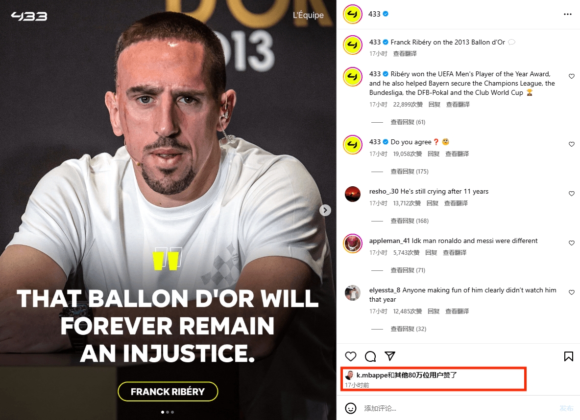 《433》昨日在ins轉(zhuǎn)載了這一報(bào)道,而姆巴佩點(diǎn)贊了這條ins。