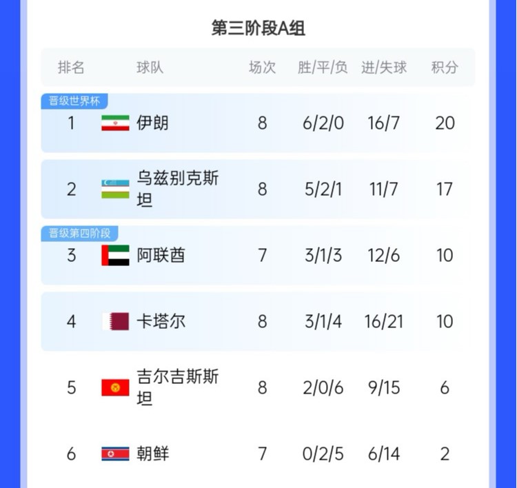 發(fā)布時間:2025年03月26日 02:50點擊:欄目:足球新聞 03月26日訊 世預賽亞洲區(qū)第三階段A組第8輪,塔雷米梅開二度,伊朗2-2戰(zhàn)平烏茲比克斯坦,提前晉級2026年世界杯。伊朗也成為第三支通過預選賽晉級2026世界杯的球隊。目前已有6隊獲得2026世界杯參賽名額,分別是東道主3隊(美國、加拿大、墨西哥)以及日本、新西蘭和伊朗。18強賽A組積分榜: 除特別注明外,本站所有內(nèi)容均為九球直播整理排版,轉載請注明出處:恭喜!伊朗提前2兩輪晉級2026世界杯,預選賽晉級第三隊 本文標簽: 足球 法甲 德甲 意甲 西甲 英超 伊朗