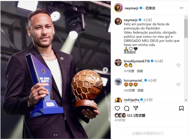 內(nèi)馬爾在對(duì)陣國(guó)際里梅拉的比賽中的角球直接破門(mén)當(dāng)選圣保羅州聯(lián)賽最佳進(jìn)球,他在社交媒體上曬出領(lǐng)獎(jiǎng)?wù)掌?,配文:“很高興參加圣保羅州聯(lián)賽頒獎(jiǎng)典禮,感謝圣保羅州足協(xié),感謝投票支持我的進(jìn)球的球迷,感謝上帝在我生命中所做的一切!”
