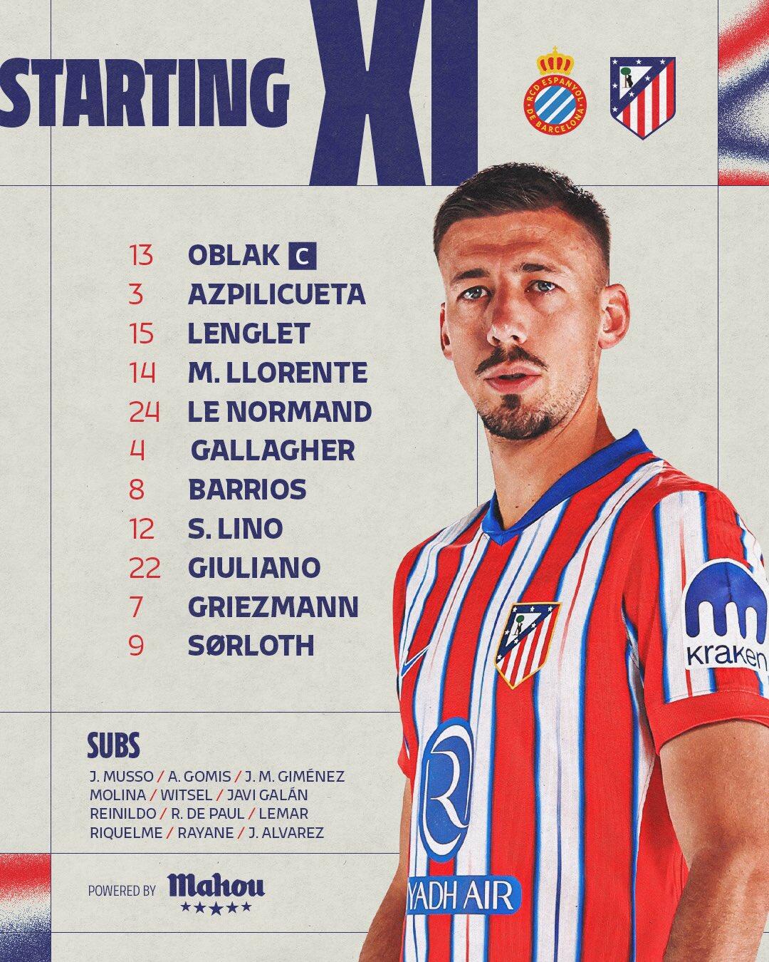 馬競(jìng)首發(fā):13-奧布拉克、3-阿茲皮利奎塔、15-朗格萊、14-馬科斯-略倫特、24-勒諾爾芒、4-加拉格爾、8-巴里奧斯、12-利諾、22-小西蒙尼、7-格列茲曼、9-索爾洛特