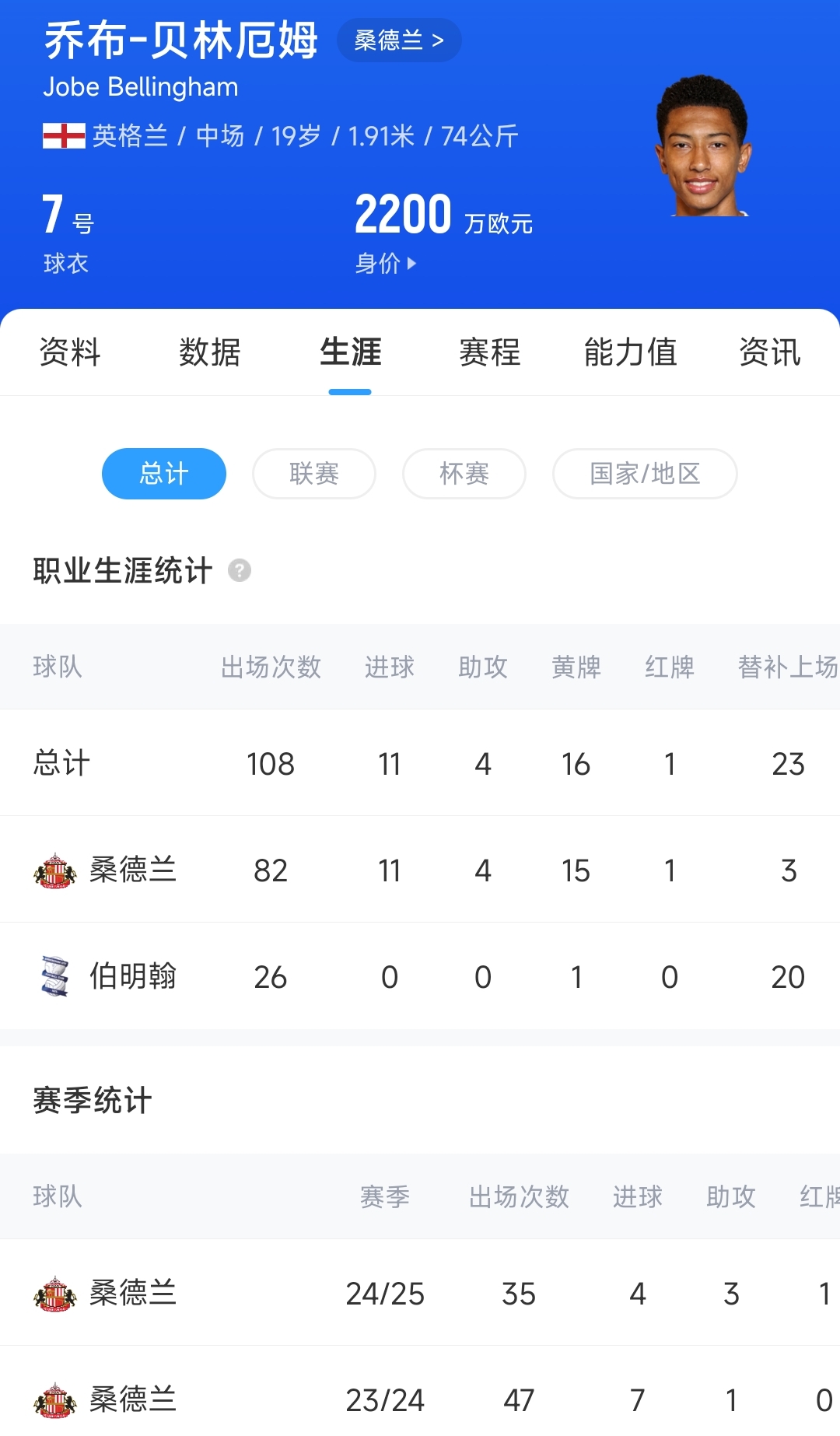 喬布-貝林厄姆是皇馬中場(chǎng)祖德-貝林厄姆的弟弟,本賽季小貝林厄姆代表桑德蘭出戰(zhàn)35場(chǎng)比賽,貢獻(xiàn)4球3助。本周稍早時(shí)候,小貝林厄姆代表英格蘭U21首發(fā)出戰(zhàn)70分鐘,幫助球隊(duì)4-2戰(zhàn)勝葡萄牙U21。