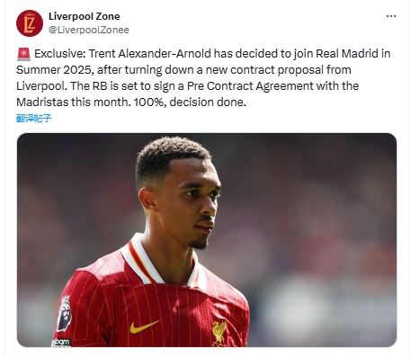 該球迷號表示:“獨家!阿諾德拒絕了利物浦的新合同提議,他已經(jīng)決定于2025年夏天加盟皇家馬德里。本月他將于與皇馬簽署一份預(yù)合同協(xié)議,100%,決定已經(jīng)做出。